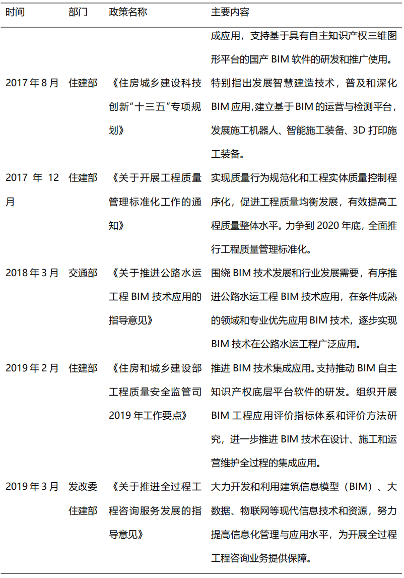 随着社会的发展,行业需求的转变,加之国家和各地政府的扶持,建筑行业信息化、数据化、智能化趋势不可逆转。BIM势必全面应用到规划、勘察、设计、施工和运营维护中来,实现工程建设项目全生命周期数据共享和信息化管理。近年来,国务院、住建部等相关单位,频繁颁发鼓励和要求应用BIM技术的指导意见,表1列出了国家层面的重要文件。