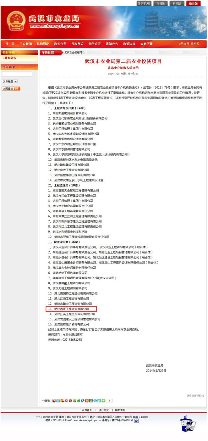 我公司入选武汉市农业局第二届农业投资项目中介机构库