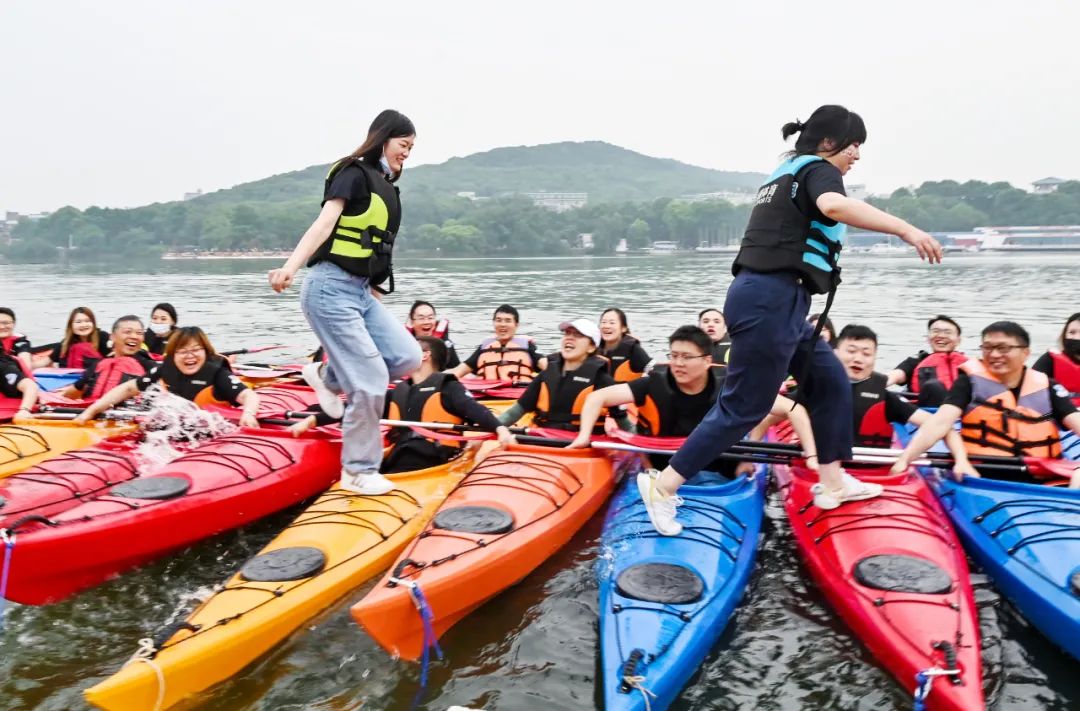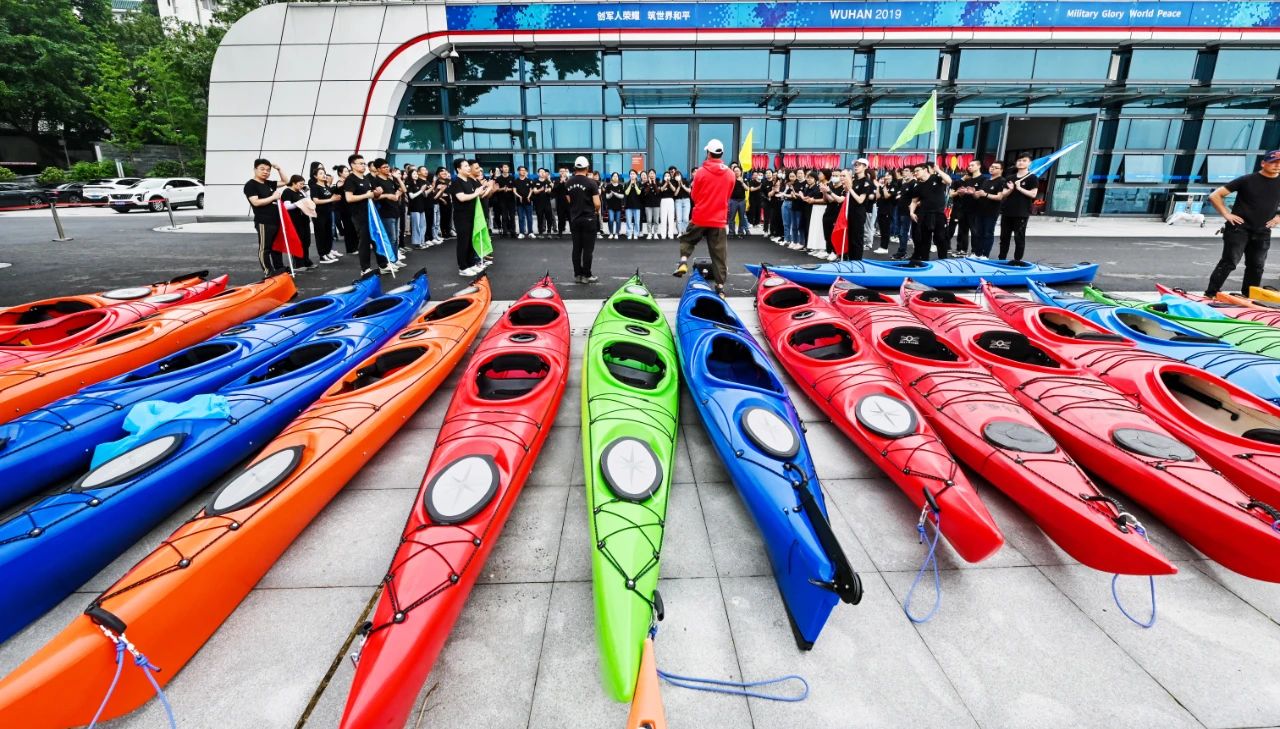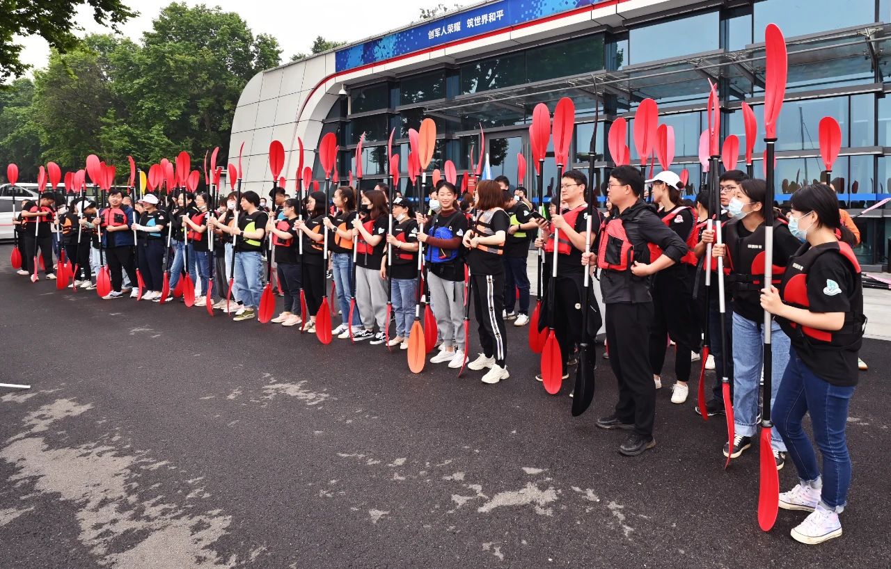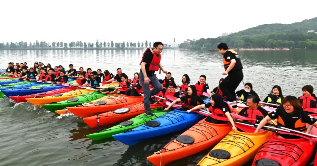 接下来是皮划艇环节,五颜六色的皮划艇整齐的排列在地上,小伙伴们早已迫不及待的穿上了救生衣,拿起了船桨,整齐的方阵蠢蠢欲动,颇有“百万雄师过大江”的气势。
