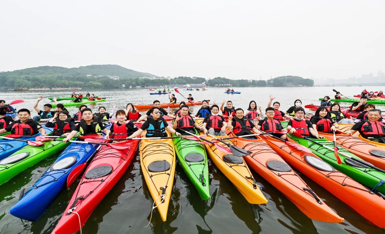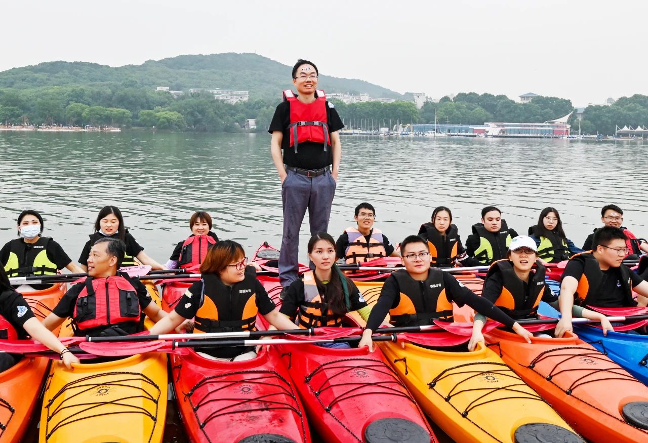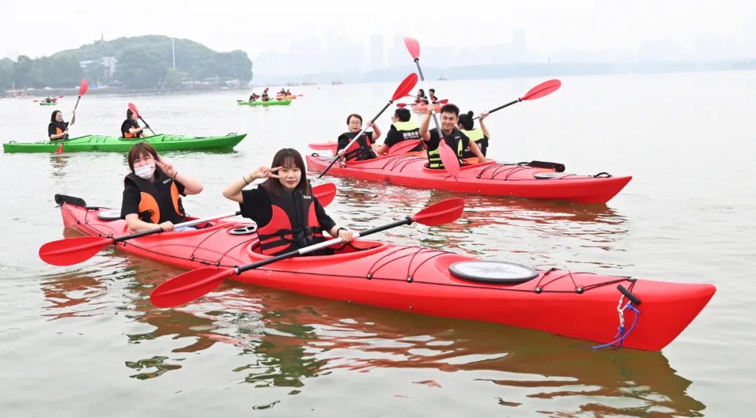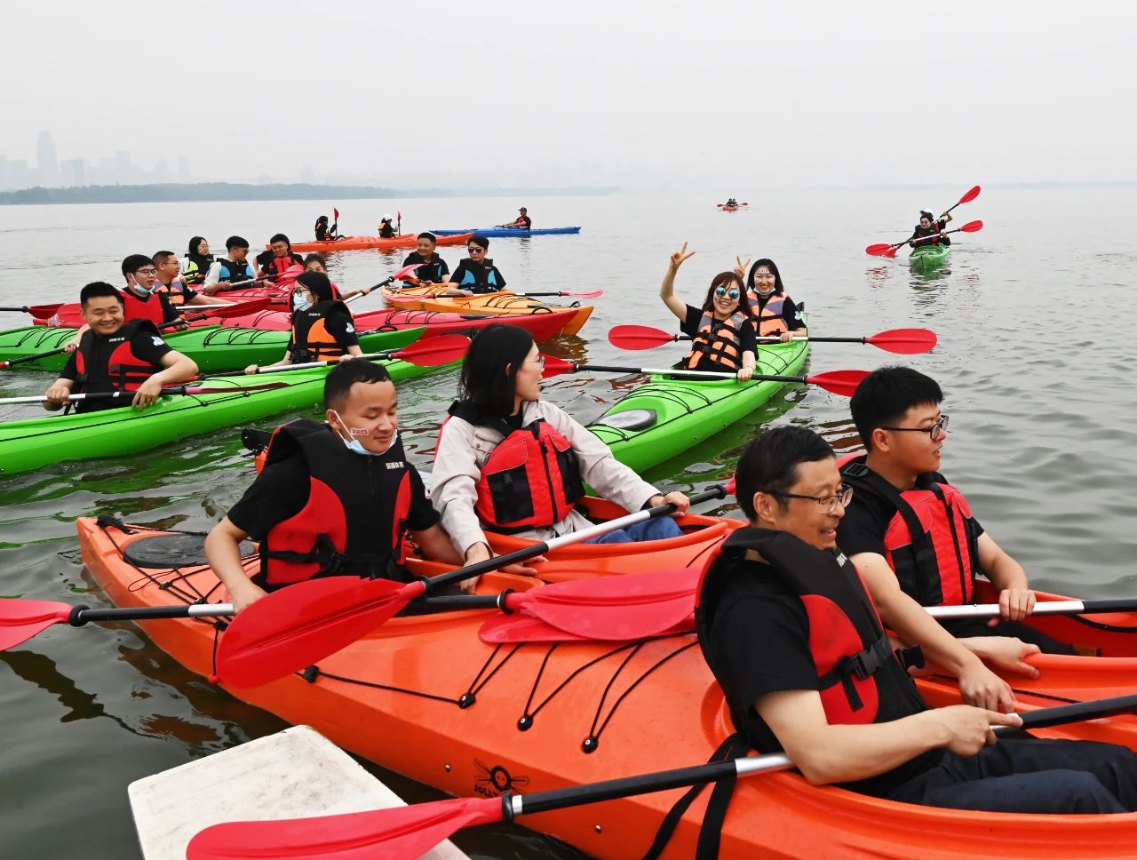 接下来是皮划艇环节,五颜六色的皮划艇整齐的排列在地上,小伙伴们早已迫不及待的穿上了救生衣,拿起了船桨,整齐的方阵蠢蠢欲动,颇有“百万雄师过大江”的气势。