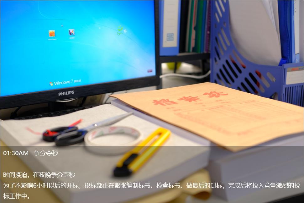 凌晨1点,投标部毓儿还在赶标书,这是她这个月第五份标书,已经连续熬了四个晚上。她说:“对于投标人说,有一大半的标书,都是在半夜里完成的。尤其是临近开标的前两天,基本都会加班到很晚。”