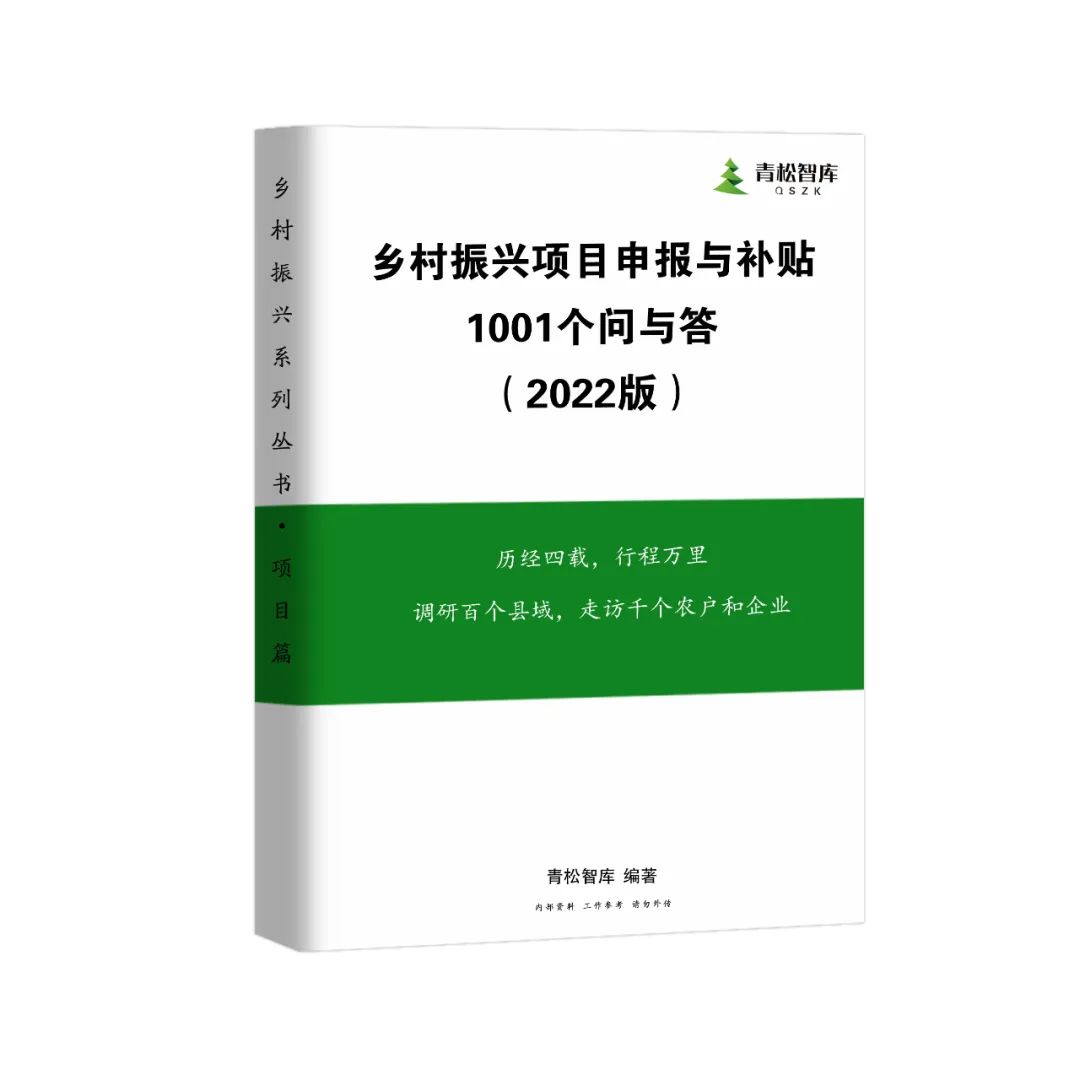 历经四载,行程万里,调研百个县域,走访千家农户(或企业),凝聚匠心,由青松智库编制的《乡村振兴项目申报与补贴1001个问与答》内部资料,数量有限,是常用工作参考工具书,有需要的请加紧与青松智库联系。