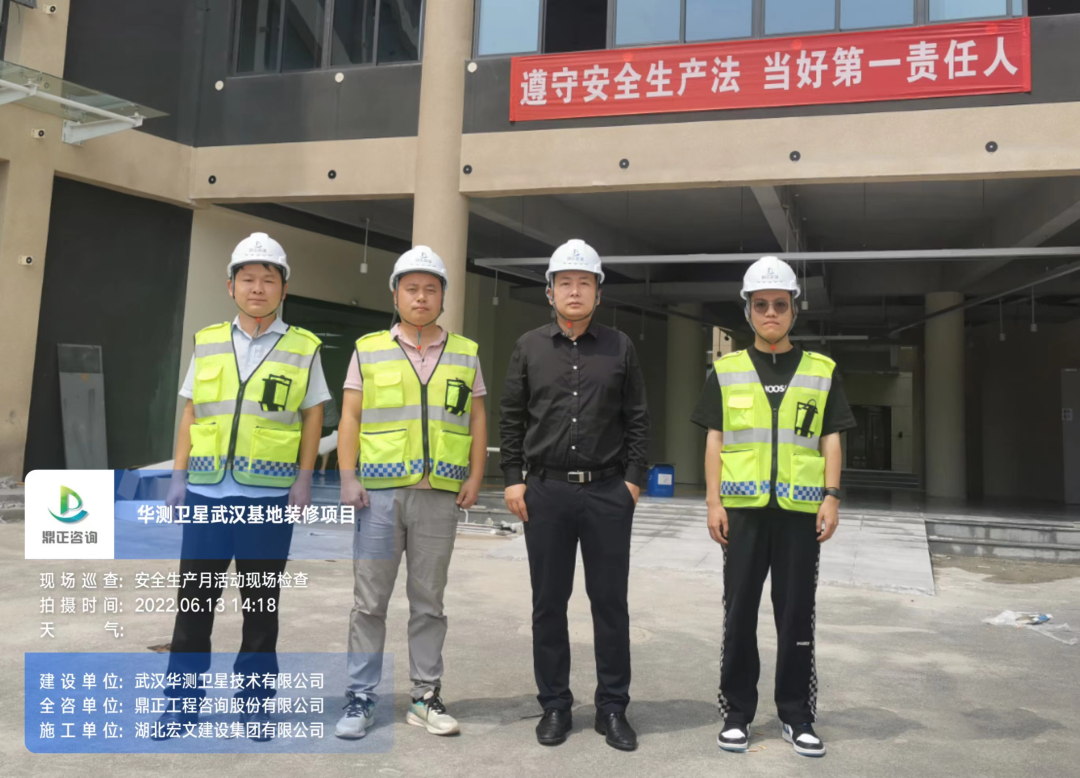 6月13日,鼎正咨询副总经理张虎、项目管理部经理张力来到华测武汉基地项目现场,开展2022年“安全生产月”活动巡查,贯彻落实“抓安全管理就要抓隐患排查”思想,对华测项目在施工期间所开展的项目安全进行检查。张总表示:“针对现场发现的安全隐患,除了通过发送安全检查报告、监理通知单方式形成书面记录以外,还要安排专人督促整改落实情况,做到安全隐患零容忍。”他强调杜绝侥幸心理,安全生产必须警钟长鸣,要遵循安全生产科学规律,及时整治潜在隐患,筑牢安全生产防线。