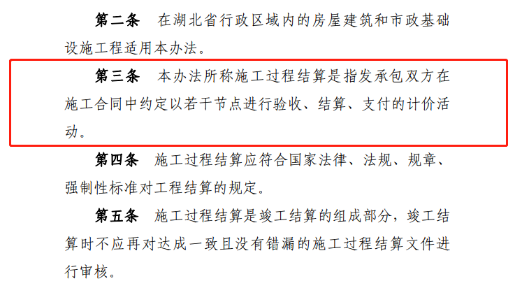 本条定义何为施工过程结算,相较住建部2021年发布的《建筑工程施工发包与承包计价管理办法》(修订征求意见稿)第十九条规定“全面推行施工过程结算和支付。发承包双方通过合同约定,按时间节点或进度节点对周期内已完成且无争议的工程量进行价款计算、确认,并按照合同约定比例支付。”《暂行办法》增加了节点验收,验收是节点结算与支付的前提。