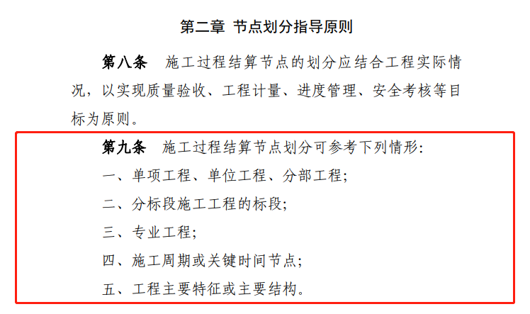 发承包双方必须在合同中约定施工过程结算节点,施工过程结算节点的划分应结合工程实际情况,以实现质量验收、工程计量、进度管理、安全考核等目标为原则,综合考虑工程建设规模、资金计划、工期计划及造价规模等因素,以如何有效实施施工过程结算为出发点,合理划分施工过程结算节点。对于合同额大、施工工期长的项目可适当增加节点数量,但节点不宜过多,过多的节点会增加工作量和降低造价管理能效,易造成界面不清楚,导致工程量计算重复或遗漏。