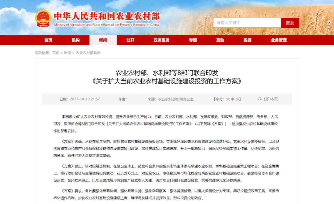 为扩大农业农村有效投资、提升农业综合生产能力,日前,农业农村部、水利部、发展改革委、财政部、自然资源部、商务部、人民银行、银保监会等8部门联合印发《关于扩大当前农业农村基础设施建设投资的工作方案》(以下简称《方案》),就加强农业农村基础设施建设作出部署安排。