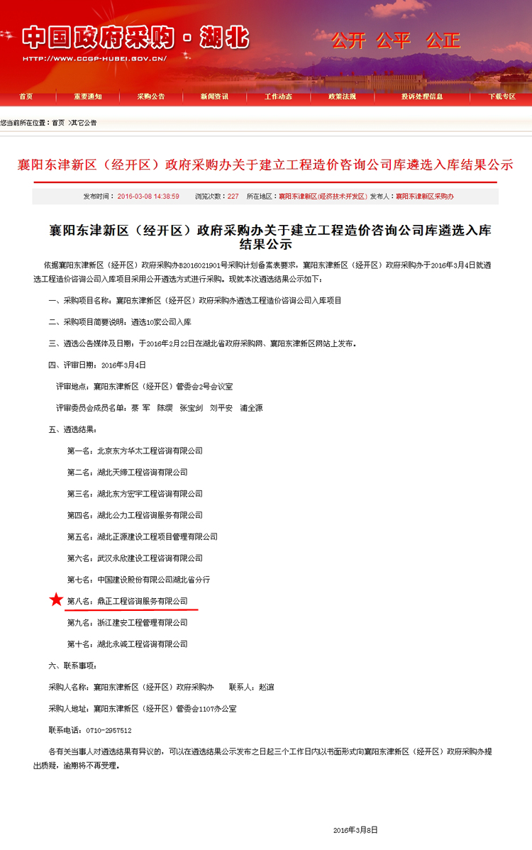 【经营成果】我司入围襄阳东津新区(经开区)政府采购办工程造价咨询公司库
