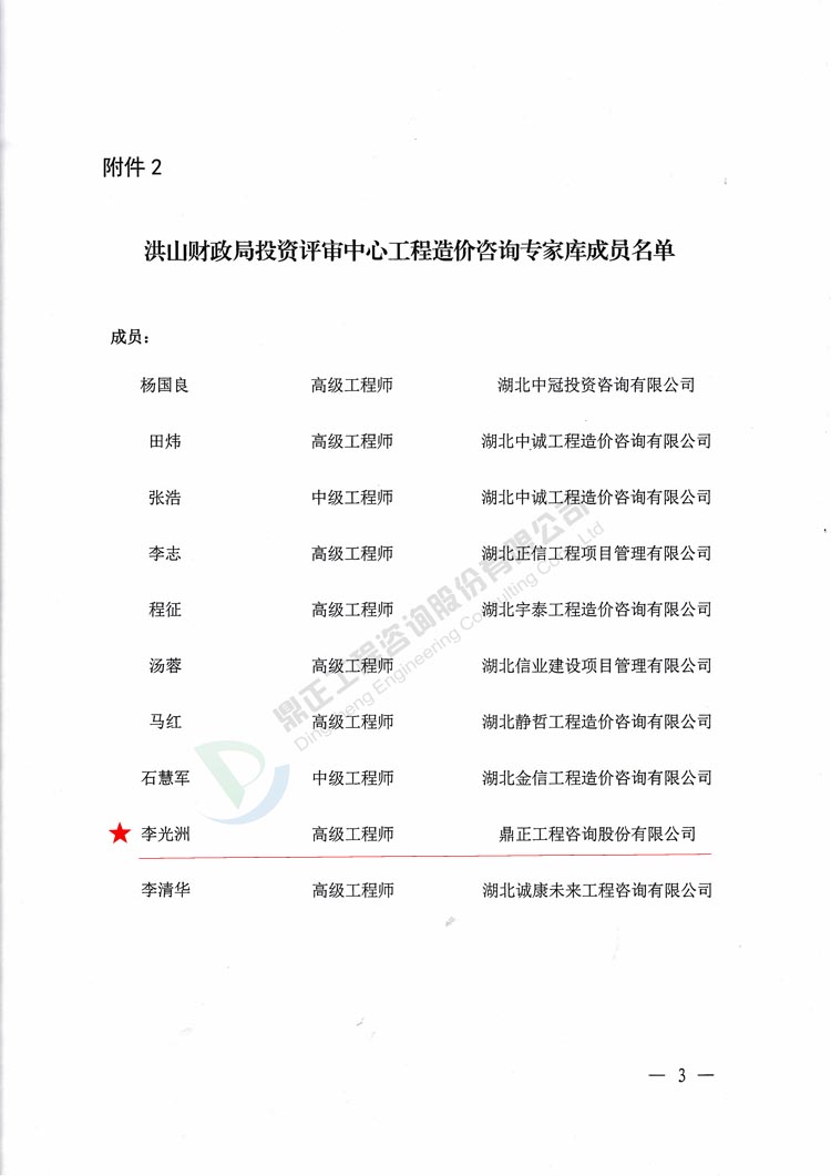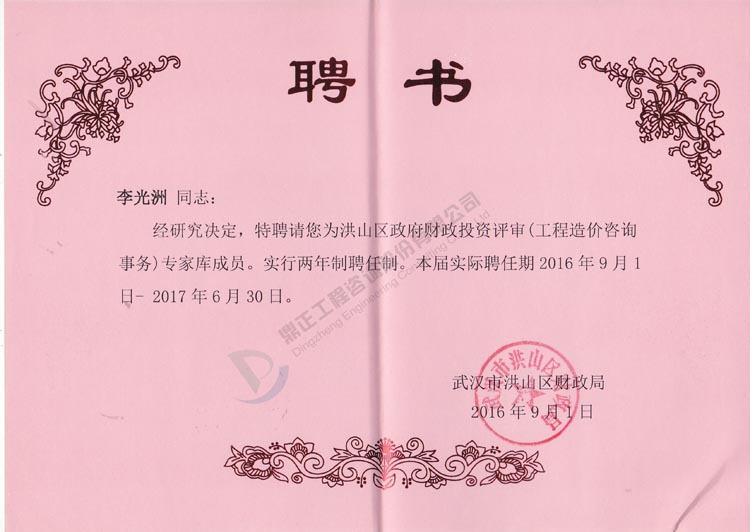 我司李光洲同志被武汉市洪山区财政局特聘为洪山区政府财政投资评审(工程造价咨询事务)专家