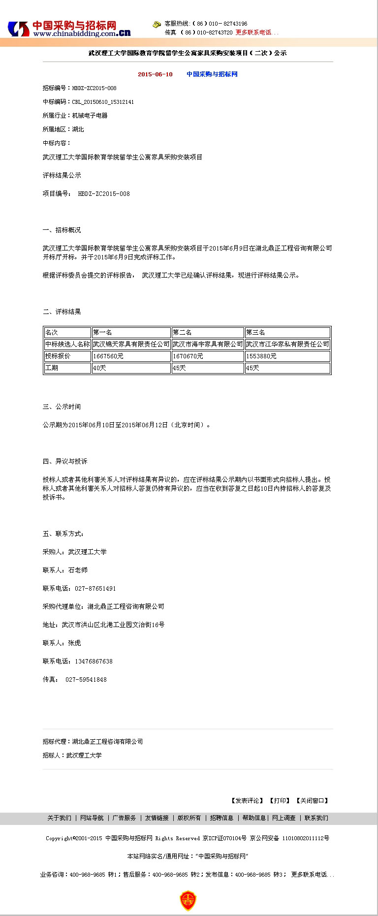 武汉理工大学国际教育学院留学生公寓家具采购安装项目(二次)公示