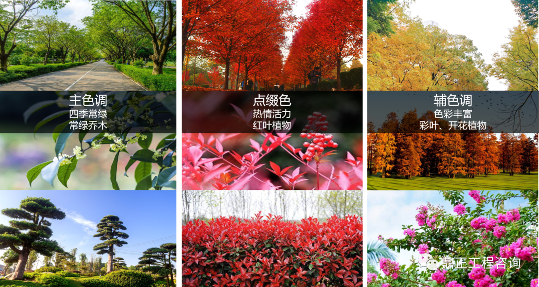 “生态园区,四季有花,处处皆景”——以常绿植物衬底,红色植物点睛,色叶交融。