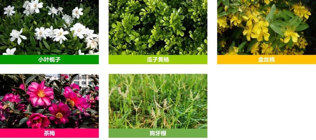 (4)此外选择花卉地被植物时,选用以观赏效果较好的春鹃、小叶栀子、金丝桃、茶梅等。