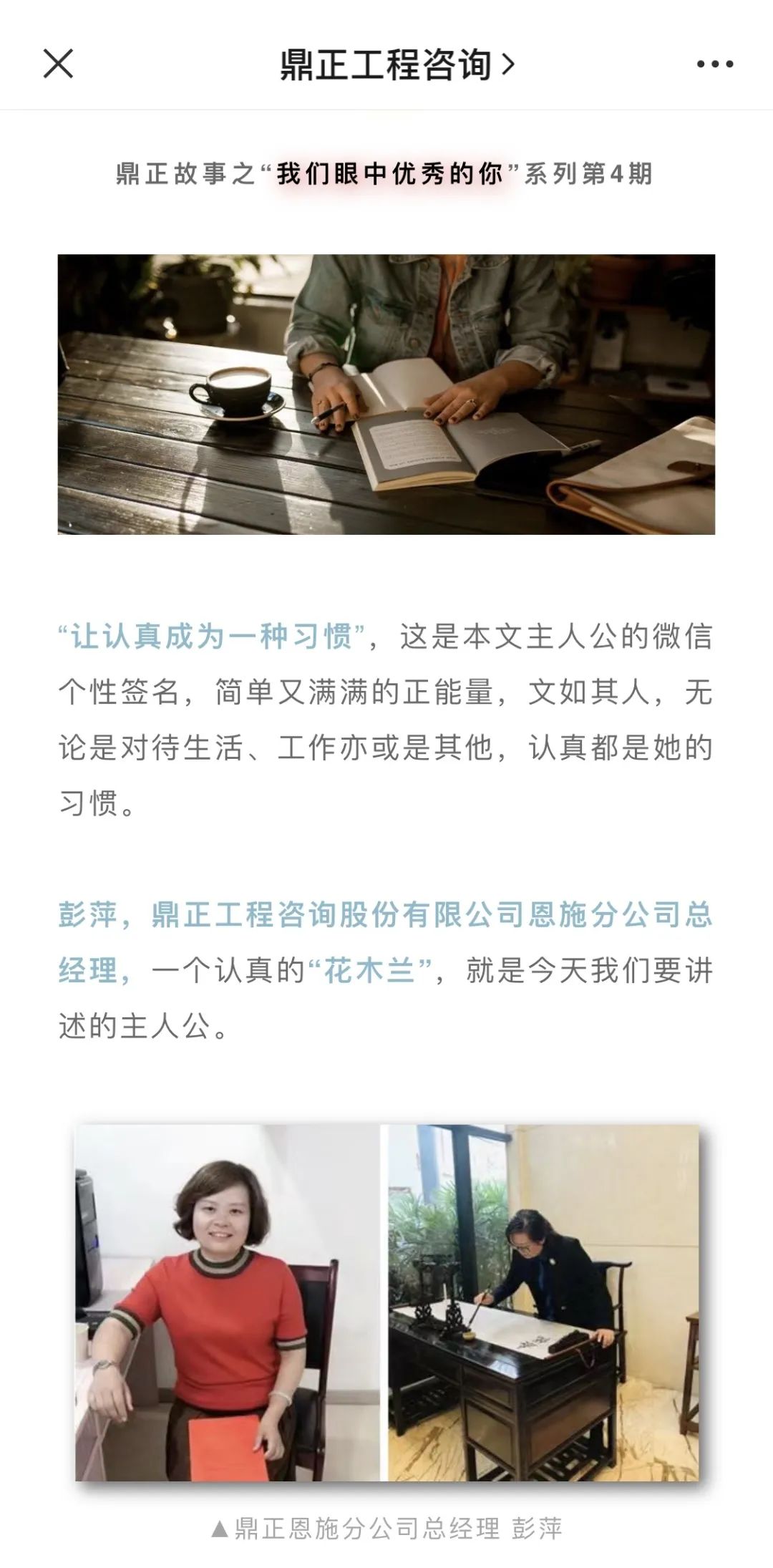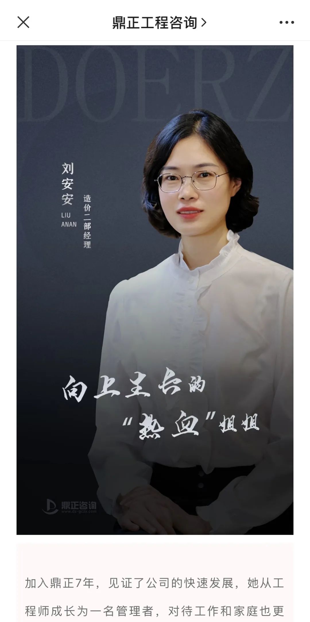 “鼎正工程咨询”微信公众号,既是公司品牌传播的窗口,也是同事们互动交流的平台。从2020年起,微信公众号便相继推出了“我们眼中优秀的你”、“鼎正故事”、“榜样人物”、“鼎正人物”等人文宣传板块,通过深度挖掘工程师的成长故事,全方位展示鼎正人的企业文化,为读者奉上一道道关于奋斗的精神大餐。