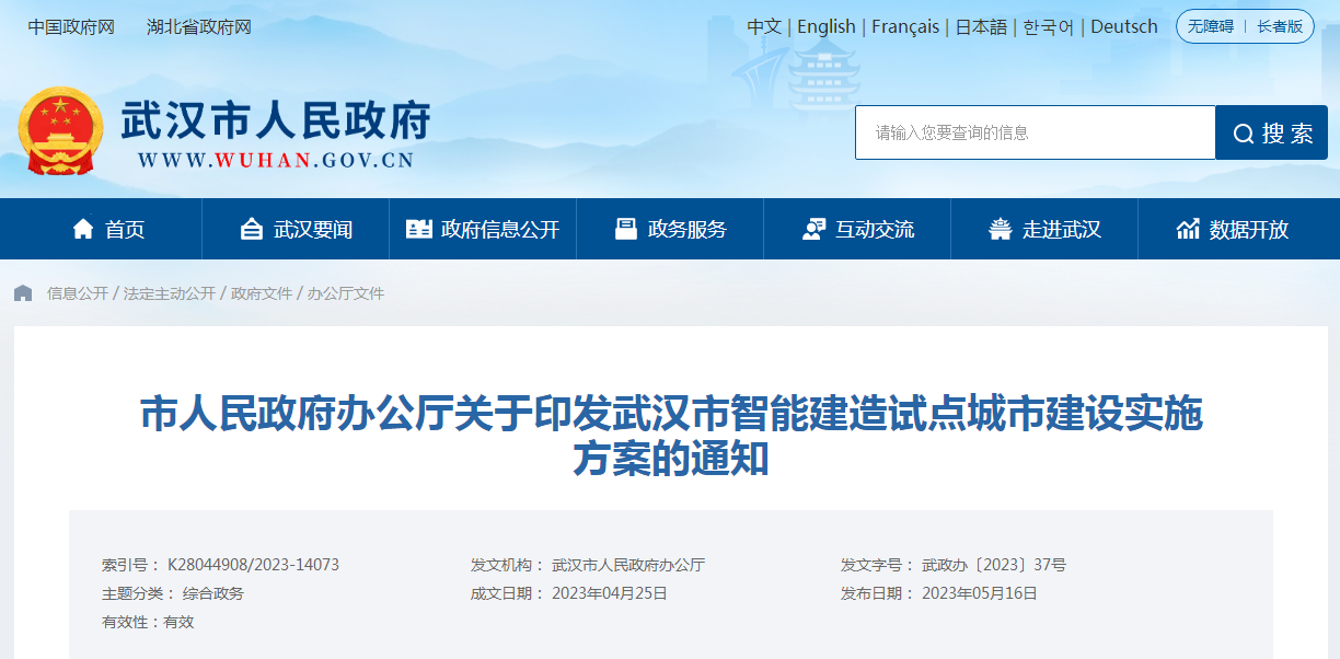 《武汉市智能建造试点城市建设实施方案》已经市人民政府同意,现印发给你们,请认真组织实施。