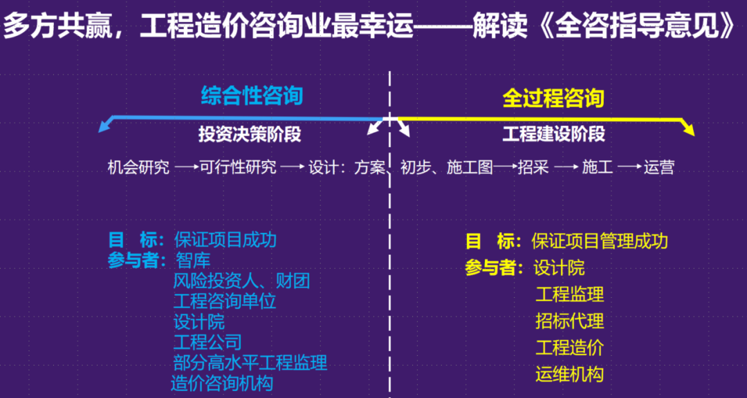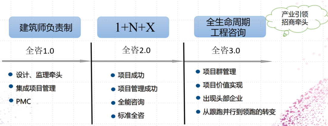 在总书记全生命周期管理思想的指导下,中国的“全咨”已经由“半岛在线体育网”过渡到“全生命周期工程咨询”,进入了全咨3.0时代。全咨3.0要点是全咨边界向前扩展到“招商引资”,向后延伸至“运营维护”。