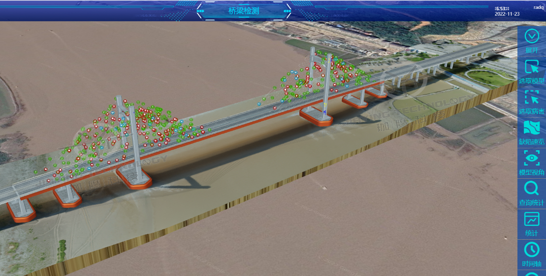 根据拍摄的高清图像重建桥梁三维模型,并定量标示各类缺陷的位置,并且搭建独立的大数据云平台,实现桥梁缺陷与病害的可视化,对桥梁问题进行三维立体化复现,为桥梁安全运行提供数据支撑。