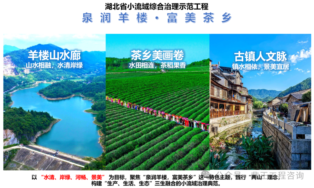 以本项目为例,设计提出以 “水清、岸绿、河畅、景美” 为目标,聚焦“泉润羊楼,富美茶乡”这一特色主题,践行“两山”理念,构建“生产、生活、生态”三生融合的小流域治理典范。