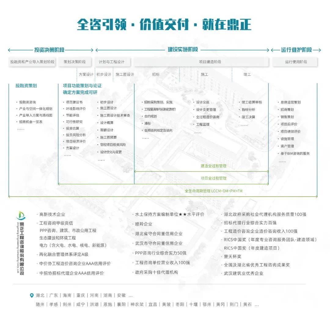 鼎正业务涵盖设计咨询产业链及工程产品产业链,既包括居住建筑、公共建筑、工业建筑等建筑设计领域,市政排水设计、市政道路设计等市政设计领域及景观绿化设计领域,也包括半岛在线体育网、全过程产业咨询、投融资咨询、项目管理、造价咨询、造价与法律纠纷咨询、招标代理等工程投资、造价、运营等业务。