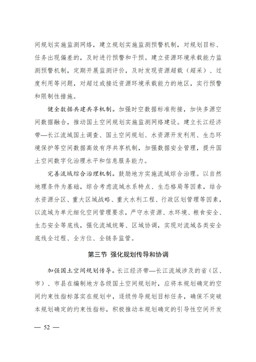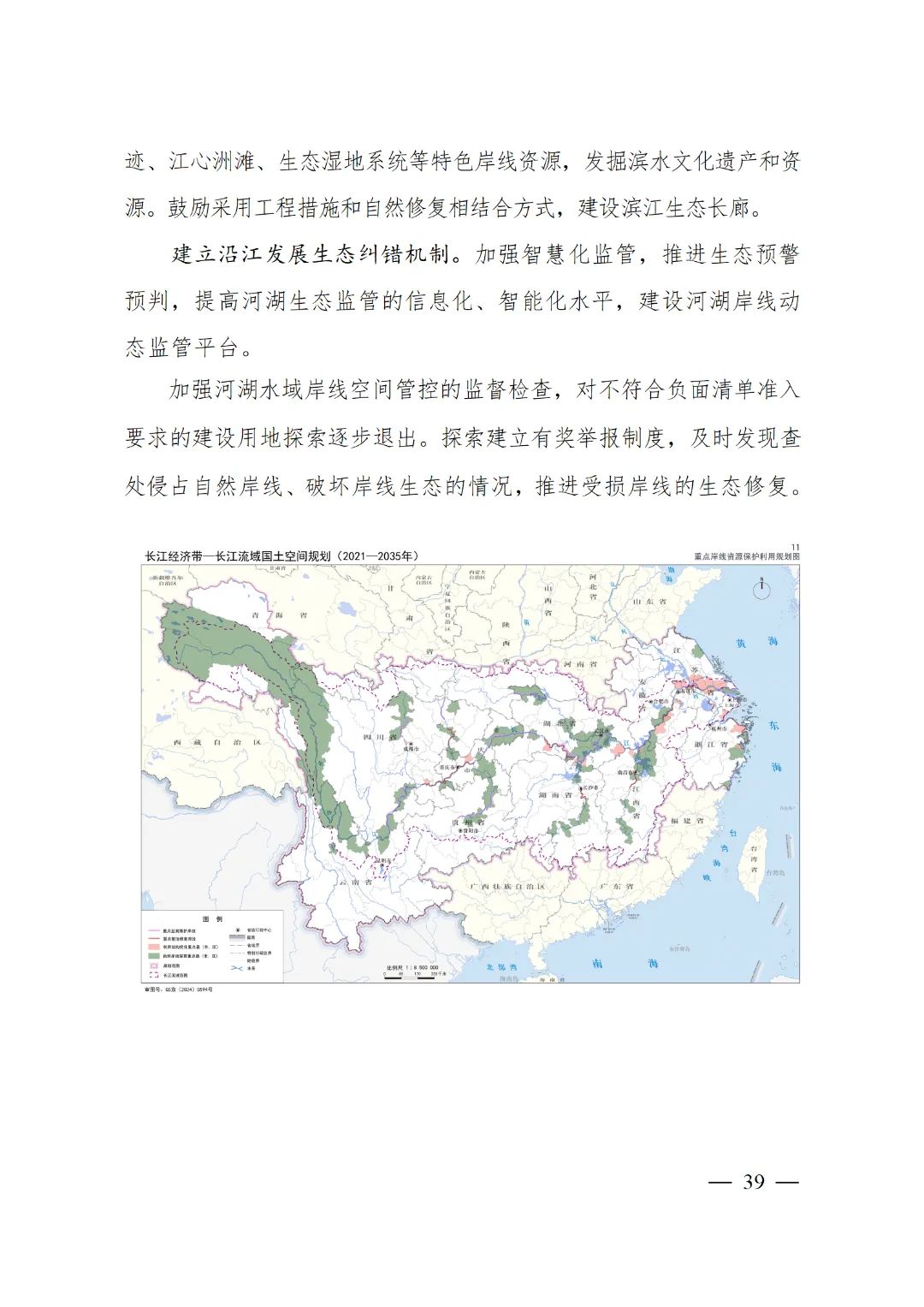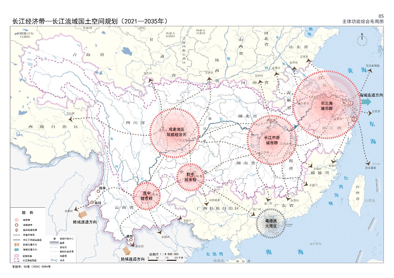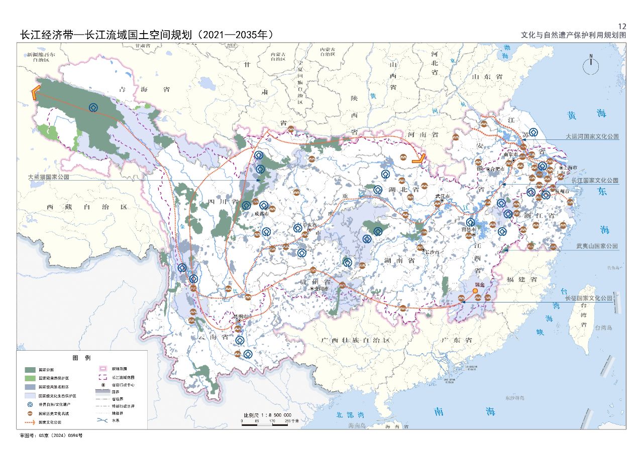 2024年2月9日,《长江经济带—长江流域国土空间规划(2021—2035年)》经国务院批复同意。9月10日,自然资源部正式印发《长江经济带—长江流域国土空间规划(2021—2035年)》。规划范围包括长江经济带11个省(市)全域,以及《长江保护法》规定的长江流域其他8省(区、市)的相关县级行政区域,共计1173个县级行政区域。规划范围包括陆域国土和内水、领海。其中,陆域面积240万平方公里。(后附规划范围详细表格)规划期限为2021年至2035年。