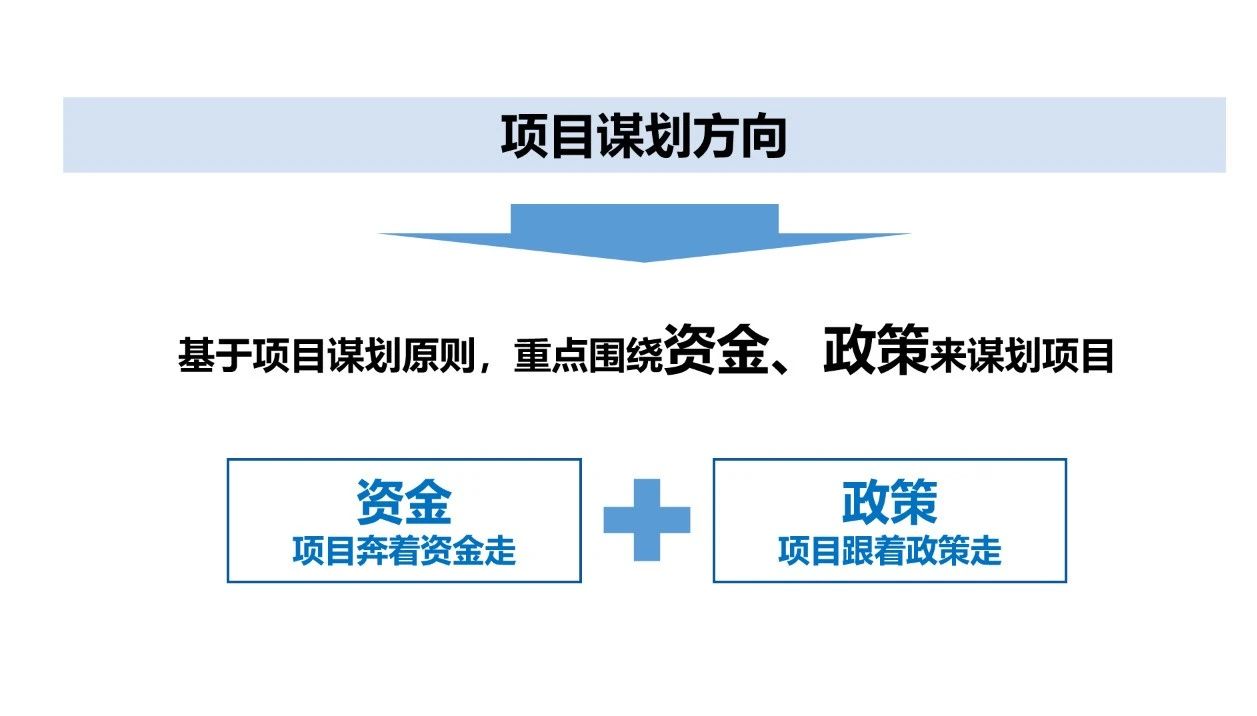 如果我们还是按照以前做项目的逻辑,那是很难获得项目的资金支持。新形势下,项目谋划应该谋什么?彭总提出两大项目谋划方向,即项目奔着资金走和项目跟着政策走。