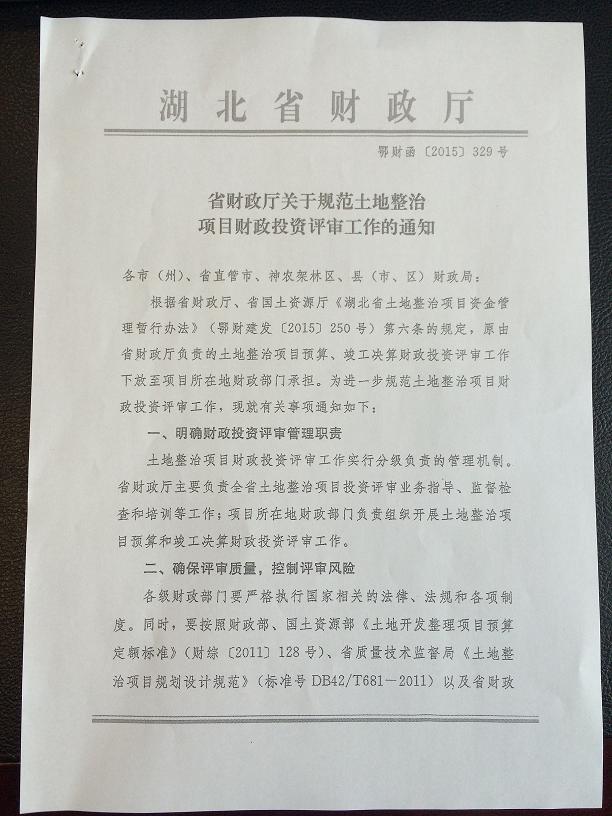 湖北省财政厅关于规范土地整治项目财政投资评审工作的通知