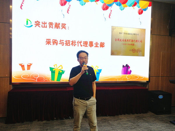 值得一提的是,今年七月我司凭借专业的服务、完善的内控制度从近千家政府采购代理机构中脱颖而出,获得首届“全国政府采购百强代理机构(2018-2019年度)”荣誉称号,这一荣誉称号离不开采购与招标事业部全体成员积极主动的参评。董事长王雁然为采购与招标事业部颁发突出贡献奖,并号召大家向采购与招标事业部学习大局意识和吃苦耐劳的工作作风。