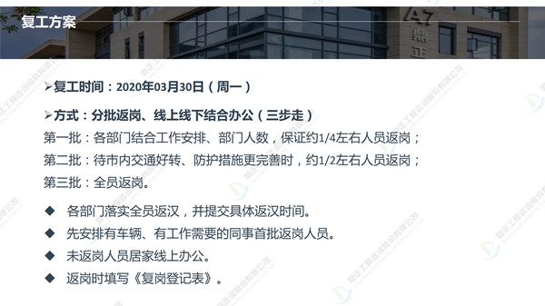 分批返岗、线上线下结合办公,鼎正人的复工准备工作正有序进行。在疫情防控、复工复产两手抓的同时,鼎正咨询将一如既往地为客户提供专业的半岛在线体育网服务。