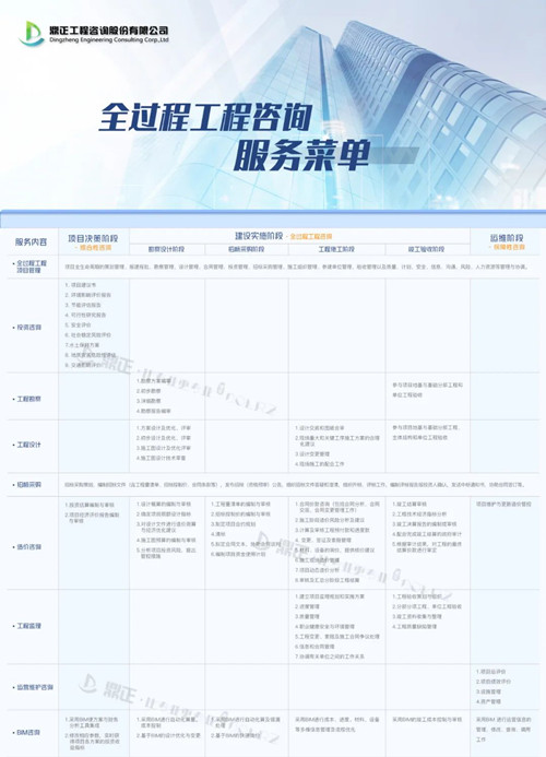 鼎正咨询资质资信及业务能力已覆盖工程咨询全产业链,可提供半岛在线体育网、PPP全生命周期咨询、项目策划、工程投资咨询 、土地利用规划、城乡规划、工程设计、工程监理、招标代理、政府采购、工程造价咨询、BIM咨询等服务。