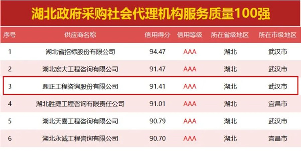 继荣获全国政府采购百强代理机构荣誉后,现由政府采购大数据研究院和政府采购大数据网联合发布的湖北省政府采购社会代理机构服务质量100强榜单,鼎正荣登湖北省政府采购社会代理机构服务质量百强,名列三甲。